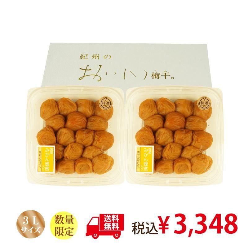 当店の通常商品(3Lサイズ)と同じ紀州和歌山産南高梅を使用し、当店1番人気の「紀州みかんはちみつ入」の塩分約5%のお味に仕上げました。250gの容器が2個、1つの化粧箱に並んだ形態となります。贈答用にもご家庭用にもお使いいただける商品となっております。※「紀州みかんはちみつ入り梅干し」は和歌山県のみかん畑で採集された「みかんはちみつ」をつかった梅干しです。